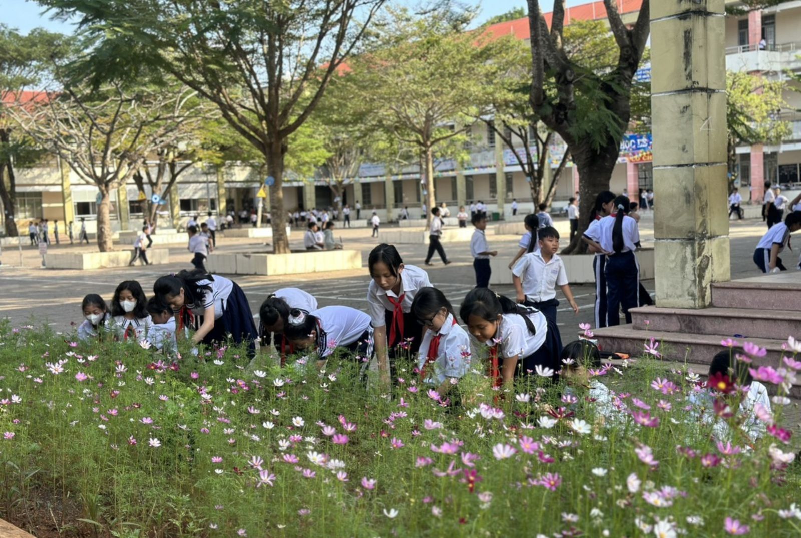 Liên đội phân công cho các em trong BCH Liên đội gieo hạt giống, chăm sóc, tưới cây, vệ sinh các bồn hoa hàng ngày vào đầu giờ trước khi vào lớp và giờ ra chơi. Các em trong BCH Liên đội đã rất chủ động chăm sóc công trình khiến cho khung cảnh trên sân trường thêm rực rỡ sắc màu.